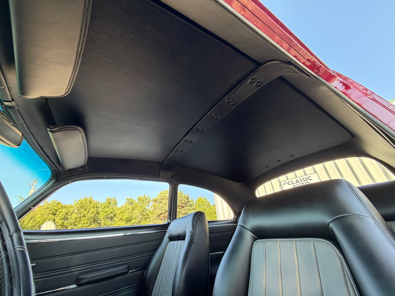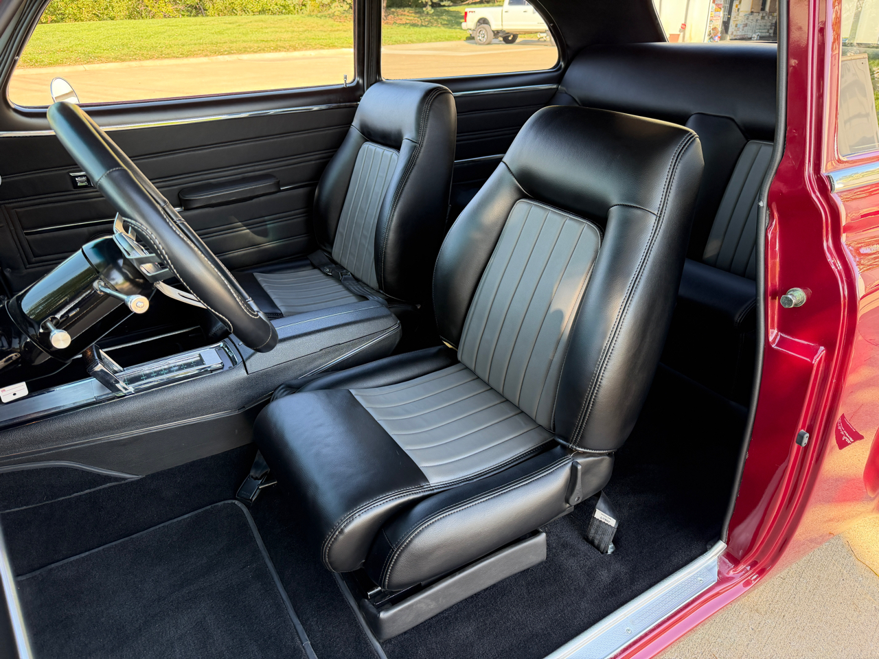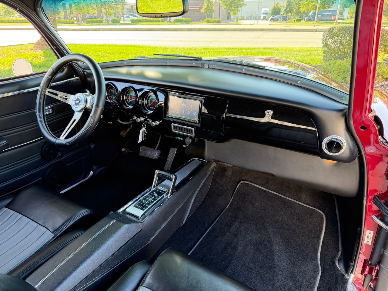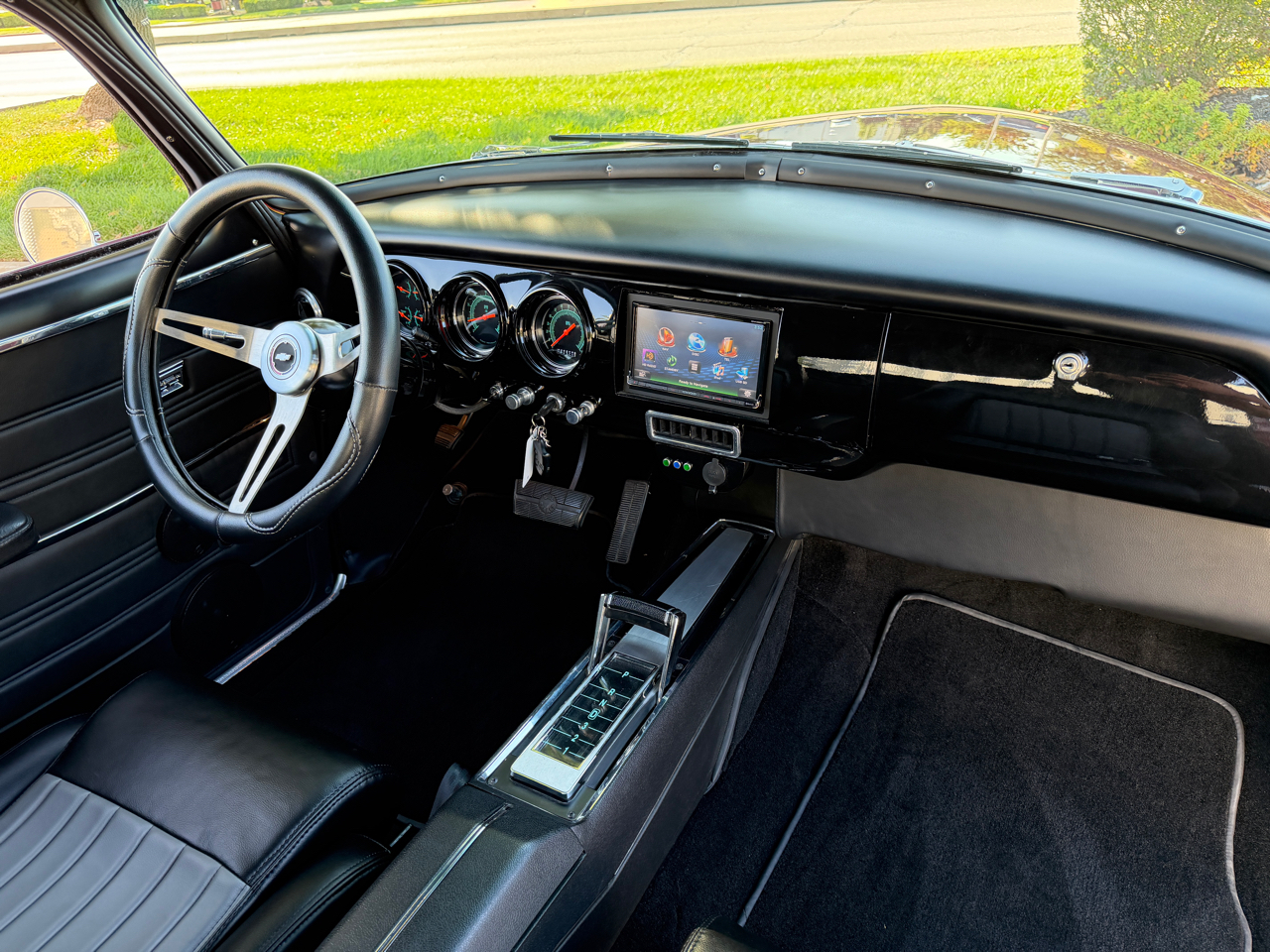 Custom black and gray interior with bucket seats, custom door panels and headliner, 1968 Chevelle center console and shifter. Hushmat sound deadening material throughout, Kenwood touchscreen receiver with voice command, Bluetooth, navigation, aux inputs, etc! JL Audio speakers in doors, JL Audio W7 10” subwoofer in custom trunk enclosure, and JL Audio amplifier. It also has Classic Industries gauges, an IDIDIT tilt steering column, and an auto dimming review mirror with compass/garage door openers.