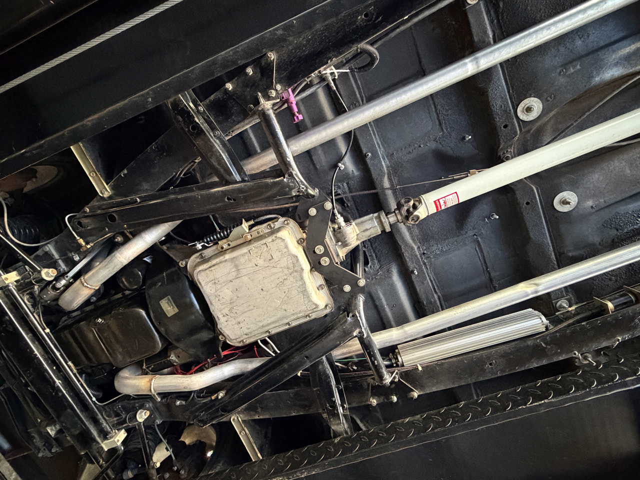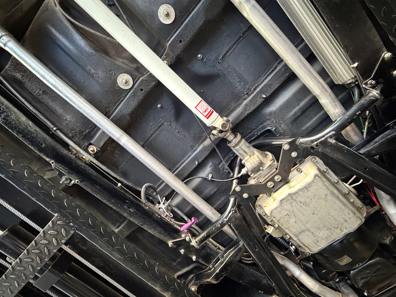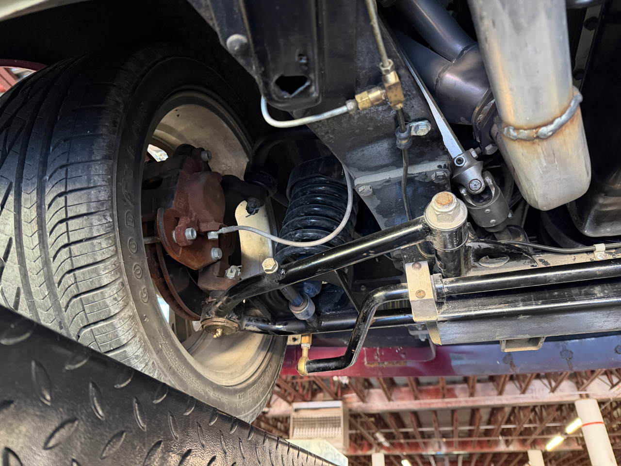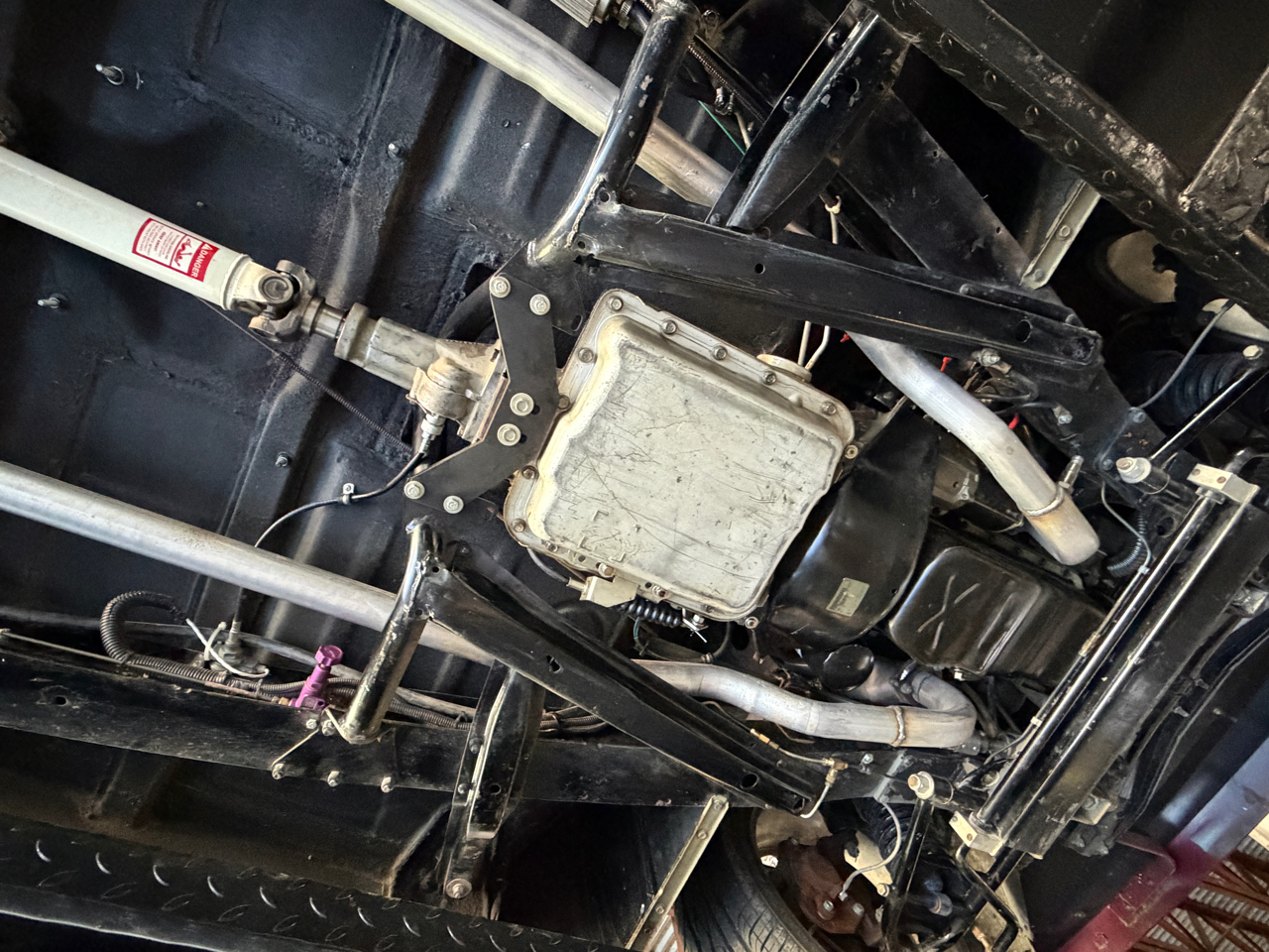 Power is sent to the ground with a 700R4 automatic overdrive transmission and a built Currie 9” rear end with 3.70 gears and 28 spline axles. Power brakes (front discs), Mustang II front end with power steering, tubular upper and lower control arms, and 2” drop spindles.
