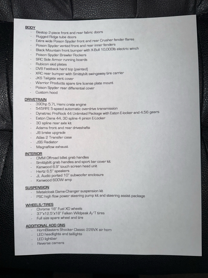 In 2016, the original engine and transmission were swapped with a 390hp 5.7L Hemi crate engine mated to a 545RFE 5-speed automatic overdrive transmission! A Dynatrac ProRock 44 Unlimited Package with Eaton E-locker and 4.56 gears, a Eaton Dana 44, 30 spline 4 pinion E-Locker, a 30 spline rear axle kit, Adams front and rear driveshafts, etc. were also added! (see photo of receipts for complete list). The drivetrain has just under 40k miles on it.